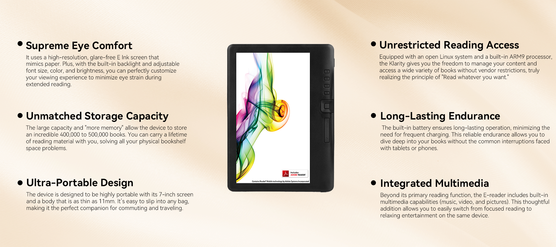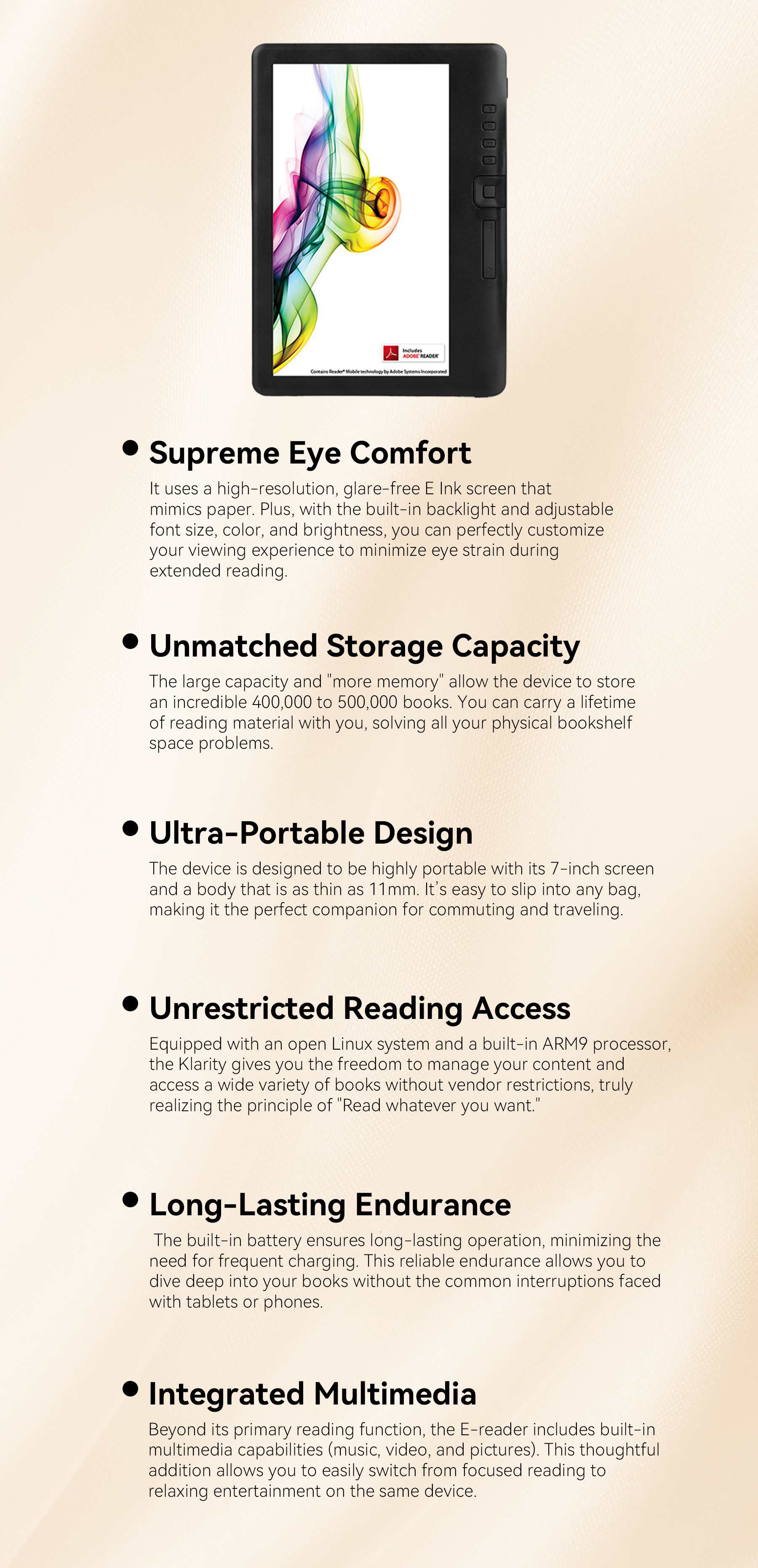 • Built-in Multimedia: Enjoy music and videos to relax after reading.